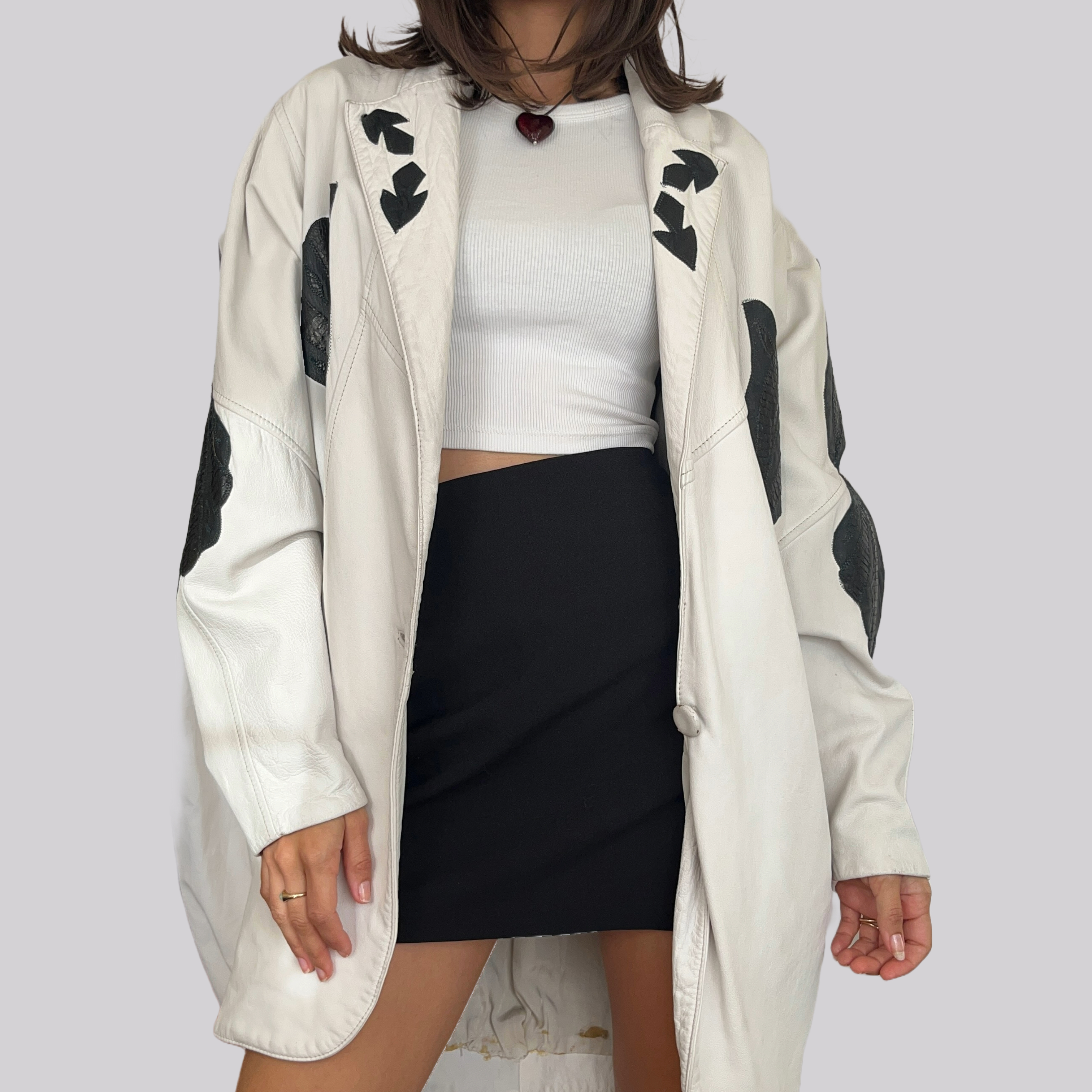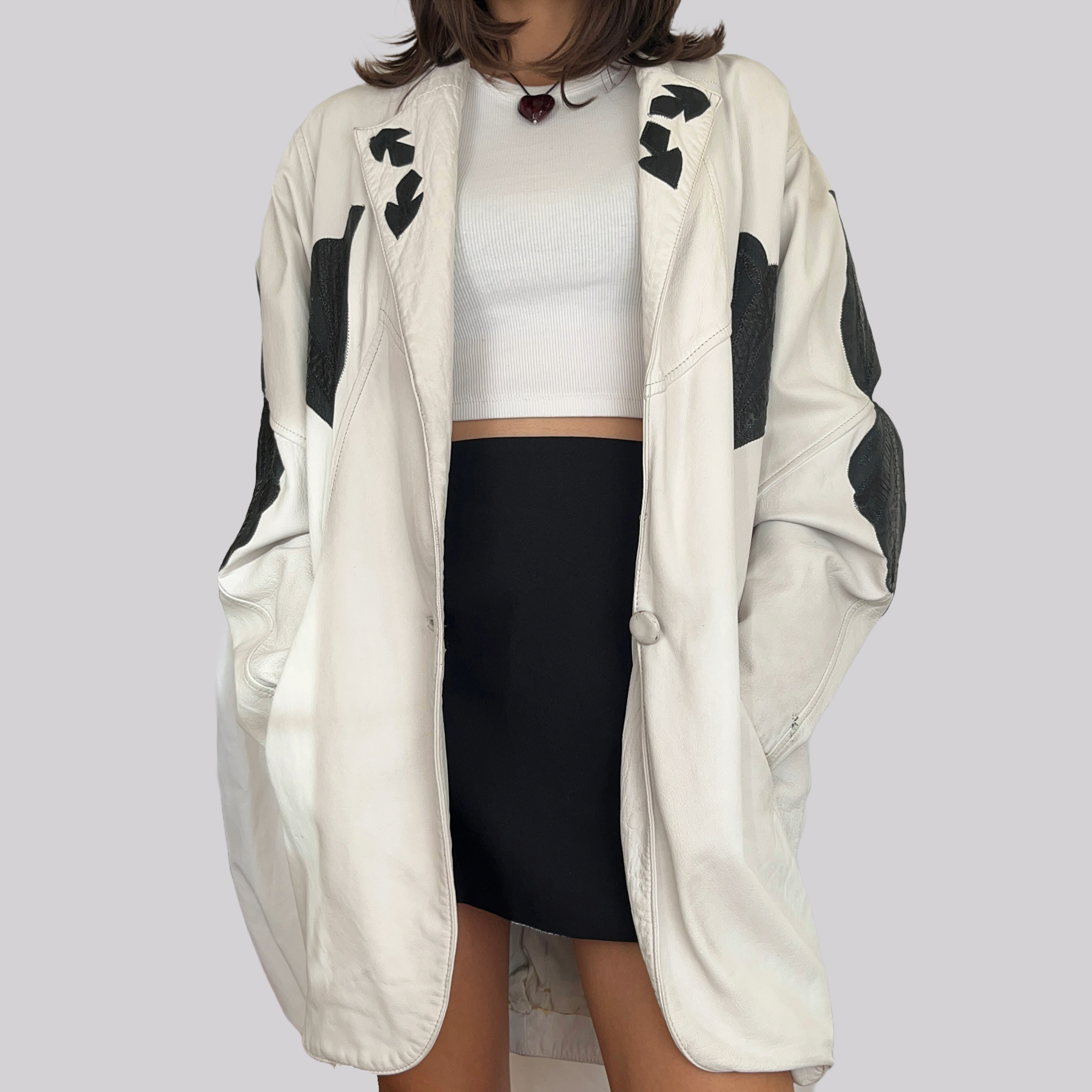Vintage Lederjacke / Kurzmantel aus den 80ern. In Weiß / Creme mit schwarzen Details. Größe S. Zwei Taschen auf der Außenseite. Wide Fit der 80s – vorallem bei den Ärmeln. Ein großer Knopf zum Schließen. Keine Angabe, ob es sich um Echtleder handelt, fühlt sich jedoch eher wie geschmeidiges Echtleder an.