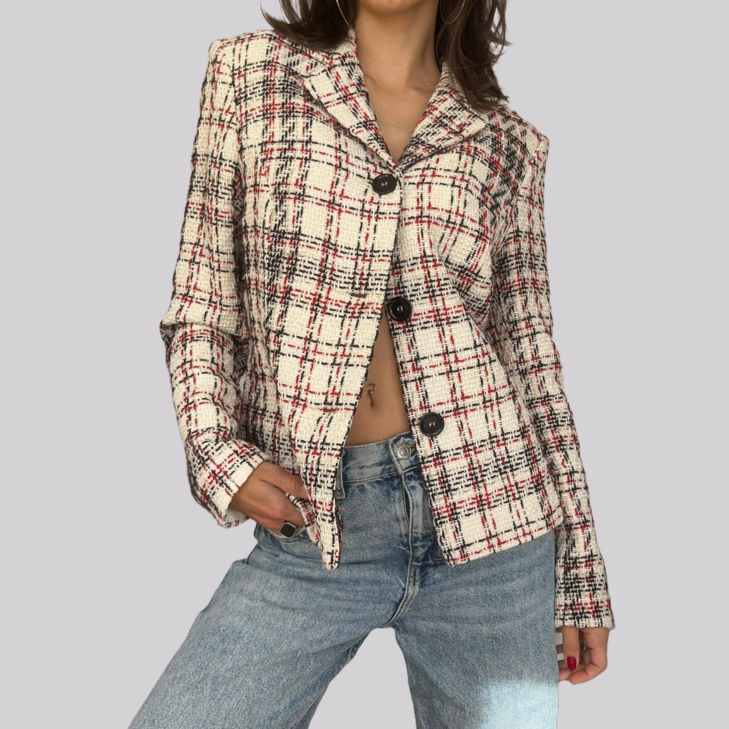 Vintage Blazer aus den späten 90er/frühen 2000er. Kariert in den Farben Weiß / Rot / Schwarz. Größe 40. Weiße Fütterung. Genaue Abmessungen siehe unten. Qualität zusammensetzend aus 50% Polyacryl und 50% Baumwolle. Schließung durch große, schwarze Knöpfe.
