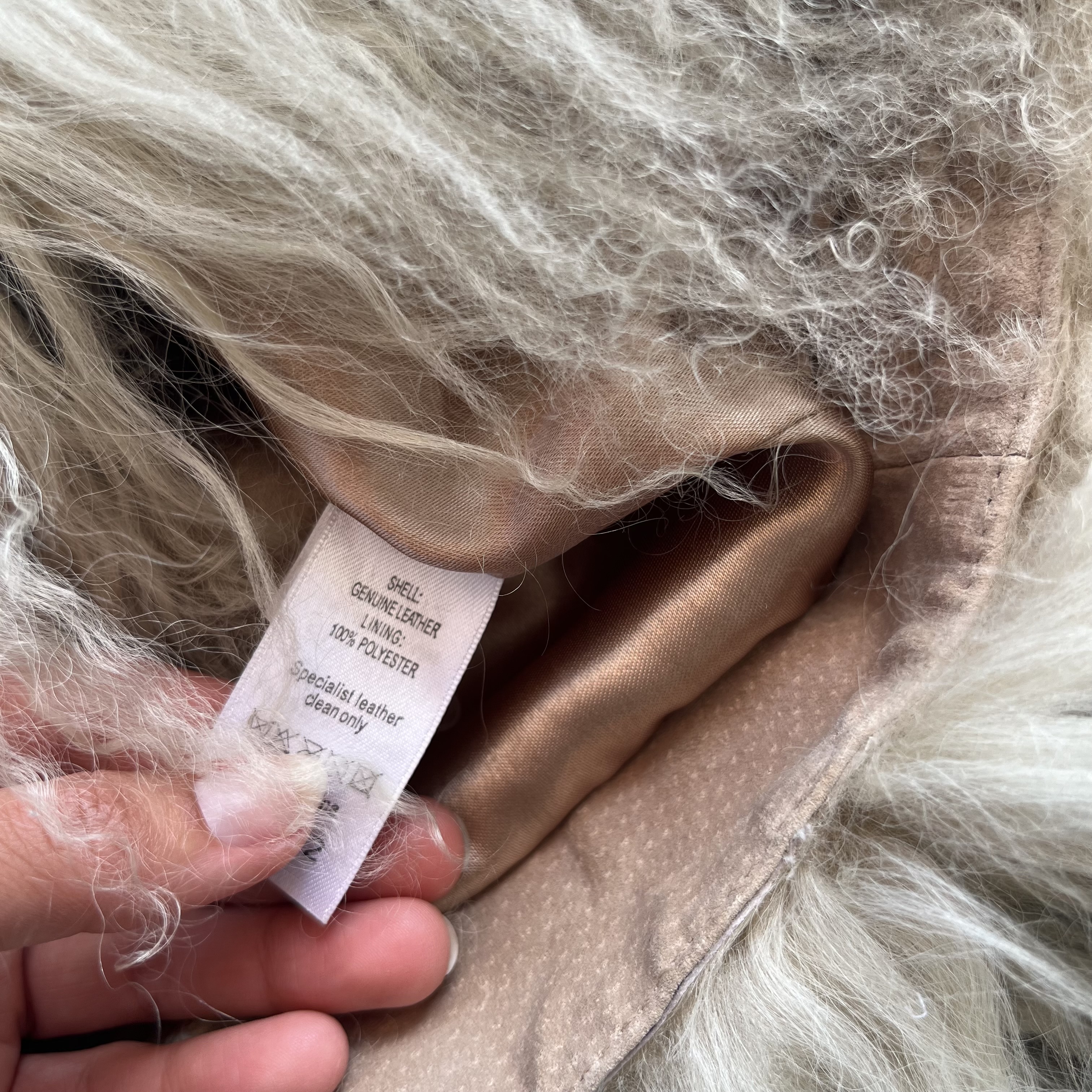 Vintage Y2K Penny Lane Jacke aus echtem Leder mit Kunstfellbesatz. Größe 36 – genaue Abmessungen siehe unten. Marke MONSOON. In beige, mit weichem Kunstfell an Kragen, Ärmeln und Saum. Innenfutter aus Polyester. Drei Haken zum Schließen.